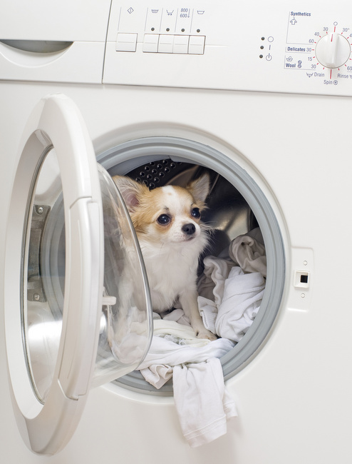 Szczenię ma niespożyte pokłady energii, nie zna lęku i jest z reguły bardzo ciekawe świata. Wejdzie dosłownie wszędzie i jeśli tylko może wpaść w tarapaty, z pewnością w nie wpadnie. Oby to się nie stało za sprawą właścicieli, którym zabrakło wyobraźni by przewidzieć, czym mogą się skończyć takie jak te, widoczne na zdjęciu zabawy. Nawet za cenę zrobienia oryginalnego zdjęcia nie wolno wsadzić psa do pralki, bo mogą zobaczyć to dzieci i w przyszłości zrobić to samo. Również psu może się w niej tak spodobać, że sam, niezauważony przez domowników kiedyś do niej wskoczy. Wystarczy że zakopie się w znajdującej się wewnątrz bieliźnie i zaśnie a ktoś włączy pralkę i nieszczęście gotowe.