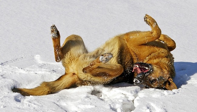 • Tarzanie się na plecach, przy akompaniamencie radosnych poszczekiwań, może oznaczać zaproszenie do zabawy. Zdarza się również, kiedy pies jest tak szczęśliwy i rozbawiony, że biega, skacze i dosłownie „nie mieści się w skórze. Świadczy to o tym, że jest w dobrej formie i nie ma najmniejszego powodu do niepokoju. Bywa, że w przypływie energii wytarza się w błocie, właścicielom domu z ogrodem pozostaje wymycie go przy pomocy węża do podlewania, mieszkańcy bloków muszą wykazać czujność i w odpowiednim momencie przytrzymać go na smyczy.