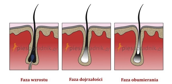 Każdy pies stopniowo wymienia sierść, wskutek czego składa się ona z włosów będących na różnych etapach wzrostu. Najpierw włos przez pewien czas rośnie (faza wzrostu), potem przestaje rosnąć i stanowi część pięknego, mocnego owłosienia (faza dojrzałości), wreszcie zaczyna się starzeć, jest coraz słabszy i stopniowo wypada, żeby zrobić miejsce nowym (faza obumierania). Jest to normalny, zgodny z natura proces, dzięki któremu całe owłosienie jest sukcesywnie wymieniane i dzięki temu pies ma zdrową sierść. Trzeba jednak odróżnić wypadanie sierści wynikające z fizjologicznej wymiany włosa od jej utraty spowodowanej chorobą, zaburzeniami hormonalnymi lub osobowościowymi. Wtedy konieczne jest jak najszybsze zdefiniowanie przyczyny problemu i niezwłoczne podjęcie odpowiednich środków zaradczych.