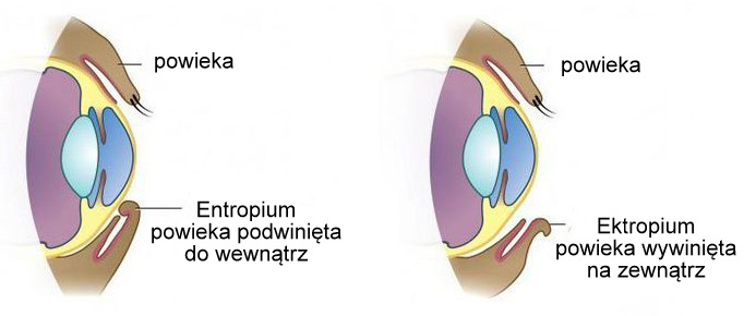 W obydwu schorzeniach mamy do czynienia z wadą powieki. Powyższe szkice pokazują na czym polega różnica: w przypadku entropii powieka podwija się w kierunku gałki ocznej, w ektropii odchyla się na zewnątrz. Dla psa ma to bardzo duże znaczenie, zarówno z uwagi na uciążliwość choroby, jak i skutki, które powoduje. Entropia jest wadą okaleczającą, podczas gdy z ektropią pies może żyć w miarę komfortowo, chyba że odchylenie powieki jest źródłem stanów zapalnych.