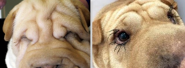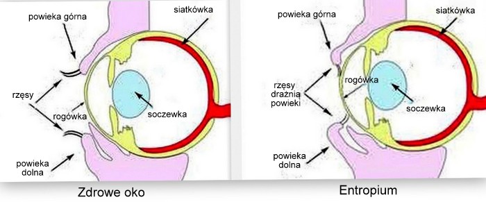 Entropia jest jedną z najczęściej spotykanych wad powiek. Nieprawidłowość polega na tym, że powieka zawija się w stronę oka, wskutek czego porastające ją włosy, zarówno rzęsy jak i sierść, dotykają gałki ocznej. Ich obecność w worku spojówkowym  powoduje nieustanne drażnienie rogówki, czego skutkiem jest niezwykle dokuczliwy, bardzo bolesny oraz stale pogłębiający się stan zapalny. Problem może dotyczyć wyłącznie dolnych powiek, co się najczęściej zdarza, ale również powiek górnych, może pojawić się w jednym lub w obydwu oczach jednocześnie. Jest to bardzo poważne schorzenie, jeśli nie będzie natychmiast leczone, może prowadzić do uszkodzenia gałki ocznej oraz znacznego upośledzenia lub nawet całkowitej utraty wzroku.