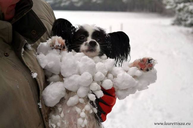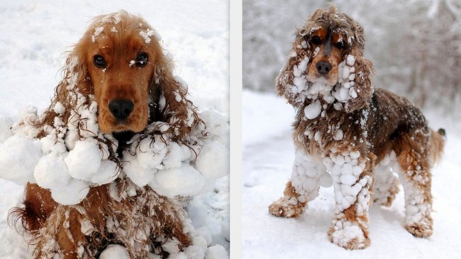 Podczas opadów śniegu, część psów o dłuższym włosie wraca ze spaceru w takim stanie, jak sunia na zdjęciu. Psy z lubością wchodzą w największe nawet sterty śniegu, po czym najchętniej wracałyby do domu na rękach właściciela.