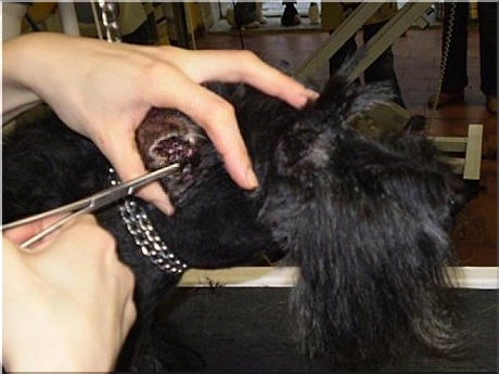 Dokładnie wyskubujemy wszystkie włoski rosnące u wejścia do kanału słuchowego, oraz w samym kanale słuchowym tak głęboko, jak jest to możliwe. Można to zrobić szczypcami lub palcami. Jeśli te włoski posypiemy specjalnym pudrem, będzie je można dużo łatwiej uchwycić. Skubiemy powoli, delikatnie, po kilka włosków, ich usuwanie całymi kępkami mogłoby być dla psa bolesne. Jest to bardzo prosty zabieg, gdybyśmy jednak nie potrafili sobie z tym poradzić, można to zrobić w gabinecie weterynaryjnym lub dobrym salonie pielęgnacji psów.