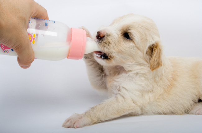Natychmiast po urodzeniu szczeniąt, zdrowa, dobrze odżywiona suka jest w stanie bez problemu sama wykarmić swoje potomstwo. Zdarza się czasem, że trzeba je karmić sztucznie już od samego początku, dzieje się tak zazwyczaj wtedy, gdy suka jest po cesarskim cięciu, osłabiona porodem lub nie ma jeszcze wystarczającej ilości pokarmu. Trzeba wówczas niezwłocznie rozpocząć podawanie mleka zastępczego, przygotowanego ściśle według zaleceń producenta i karmić nim tak długo, aż w sutkach pojawi się mleko. Z rozpoczęciem karmienia nie wolno zwlekać, bo bez tego szczenięta nie przeżyją. Mleko zastępcze podaje się butelką ze smoczkiem, co dwie godziny, na okrągło, przez całą dobę.