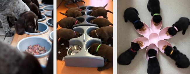 Co do sposobu podawania jedzenia, są dwie szkoły: jedni twierdzą, że pieski powinny jeść z jednej miski, bo wtedy muszą się do niej dopychać i uczą się przebojowości, drudzy, że każde szczenię powinno mieć swoją miskę, bo tylko wtedy można kontrolować, ile każde z nich zjadło. Wybór należy do hodowcy. Na zdjęciach widać jak można rozwiązać problem karmienia metodą jeden piesek – jedna miska. Zaletą pokazanych rozwiązań jest to, że szczenię nie może przesunąć miski ani do niej wejść. To bardzo ułatwia utrzymanie czystości.