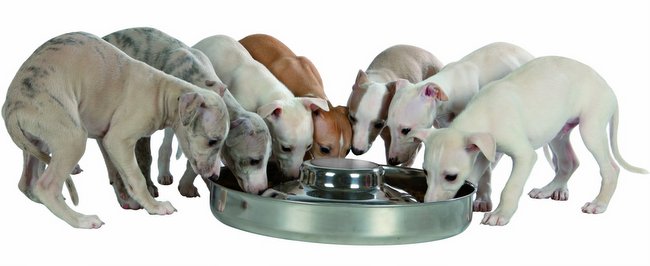 Zwolennikom wspólnej jadalni polecam specjalne miski do karmienia szczeniąt, które uniemożliwiają im wejście w nie łapkami. Przy licznych miotach lub większych psach można postawić obok siebie dwie lub nawet trzy identyczne miski. W momencie, gdy zaczynamy dokarmiać szczeniaki, musimy zapewnić im stały dostęp do świeżej wody. Najlepsze do tego celu są specjalne miski zamykane pokrywką z niewielkim otworem pośrodku, podwieszane miseczki, których nie można przewrócić lub specjalne poidełka. Dobra miska powinna być tak skonstruowana, by pies nie mógł do niej wejść ani jej wywrócić. Przy zastosowaniu zwykłych talerzy szczenięta byłyby wiecznie upaprane jedzeniem i skąpane w wodzie.