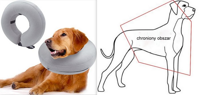 Kołnierz przeznaczony dla dużych psów. Wewnątrz znajduje się przystosowana do ustnego nadmuchiwania „oponka”, na zewnątrz miękki, zapinany na zamek błyskawiczny, bardzo łatwy do prania pokrowiec. Nadaje się dla psów o obwodzie szyi 43 do 54 cm, reguluje się go przy pomocy widocznego na dole paska, który umieszcza się w tyle szyi. Wewnątrz oponki znajdują się trzy czarne szlufki, pod którymi przewleka się obrożę, a następnie zapina się ją na szyi psa, dzięki czemu kołnierz nie obraca się, nie zsuwa i pozostaje na swoim miejscu. Jeśli nie jest używany, wypuszcza się z niego powietrze, po czym chowa się go do szafy. Szkic pokazuje obszar ciała, do którego, dzięki zastosowaniu kołnierza, pies nie ma dostępu.