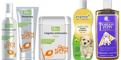 Do pielęgnacji szczeniąt powinno się używać profesjonalnych kosmetyków, opracowanych specjalnie dla szczenięcej sierści, wyprodukowanych na bazie składników, które nie wywołują alergii. Pamiętajmy, że do kąpania szczeniąt nie powinno się używać szamponów przeznaczonych dla ludzi, w tym także te dla niemowląt, ponieważ mają za wysokie pH, (5,5 zamiast 3,5) i dlatego wysuszają i niszczą sierść. Warto zadbać o szczenięce owłosienie, bo ma bardzo duży wpływ na późniejszą „dorosłą” szatę. Na tym etapie życia nie trzeba wielu kosmetyków, potrzebny jest przede wszystkim dobry szampon oraz lotion do czyszczenia sierści bez użycia wody. Więcej na temat doboru środków pielęgnacyjnych w zakładce Jak dobierać kosmetyki ?
