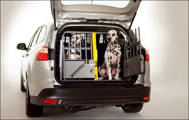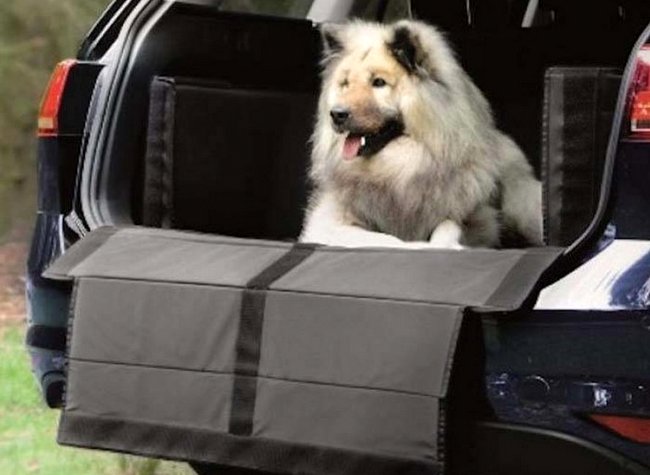 W samochodzie typu hatchback lub kombi, najlepiej przewozić go w przestrzeni bagażowej. Oczywiście pod warunkiem, że jest całkowicie pusta, bo jeśli obok niego postawimy ciężką, nieprzymocowaną walizkę, podczas hamowania może się przesunąć i połamać mu nogi. To miejsce doskonale zdaje egzamin, zwłaszcza w deszczowy dzień, bo wnętrze samochodu pozostaje czyste, poza tym pies ma więcej swobody. Trzeba je jednak odpowiednio przygotować. Na spód kładziemy matę przeciwpoślizgową a na długie trasy kładziemy dopasowany wielkością materac, żeby się nie przesuwał i psu było wygodnie. Przestrzeń bagażnika oddzielamy od wnętrza samochodu specjalną metalową kratką, lub zbudowaną z kilku prętów przegrodą. Jest to optymalne rozwiązanie zarówno dla psa, jak i dla pasażerów, bo w przypadku kolizji lub ostrego hamowania pies zatrzyma się na przegrodzie. Przy zakupie trzeba ją bardzo dokładnie obejrzeć i upewnić się, czy posiada atest. Oferta jest bardzo duża: są przegrody składane, rozsuwane, które są wygodne, bo można je dopasować do każdego modelu samochodu, ale większość z nich nie zapewnia tego co najważniejsze: bezpieczeństwa. Wprawdzie uniemożliwiają psu przedostanie się do wnętrza samochodu, ale jak wykazują badania, w przypadku niewielkiej nawet kolizji wyskakują z miejsca, w którym zostały zamontowane. Najczęściej łamią się na wiele ostrych kawałków i powodują większe obrażenia psa i pasażerów, niż w przypadku, gdyby ich nie było.