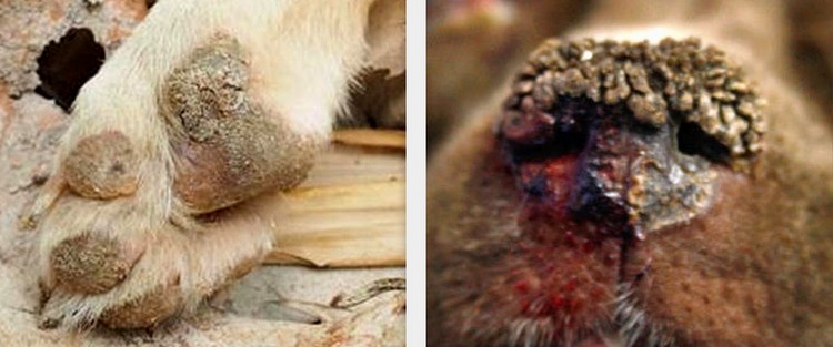- Postać skórna. W tej postaci nosówki na wewnętrznej stronie uszu oraz na udach i brzuchu pojawiają się zaczerwienienia, podrażnienia oraz krostki lub pęcherzyki. Najpóźniej pojawiającą się odmianą postaci skórnej jest choroba twardej łapy. Skóra na lusterku nosa i opuszkach łap twardnieje, staje się szorstka i spękana. Ta postać nosówki występuje często równolegle z objawami neurologicznymi.