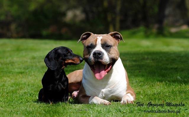 Z wielką ostrożnością trzeba podejść do zakupu amstaffa, jeśli w domu jest już jeden pies, zwłaszcza drugi samiec o dominującym charakterze. Łatwiej się z sobą zżyją, jeśli się razem wychowają, jego kompan jest innej płci a w dodatku jest stworzeniem spokojnym, które mu się całkowicie podporządkuje. Nie bez znaczenia jest mocna pozycja właściciela jako przewodnika stada. W stosunku do innych psów trzeba zachować daleko idącą ostrożność, na spacerze prowadzić psa zawsze na smyczy i nie dopuścić do bójki, bo łatwo może mu to wejść w zwyczaj.