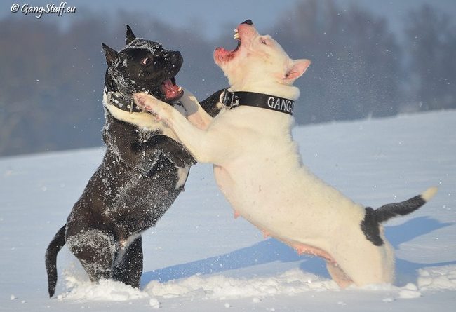 Przyjacielsko nastawiony do ludzi amstaff, ma niestety wrodzoną skłonność do walki z innymi psami, szczególnie z osobnikami tej samej płci. Z tego powodu jego relacje z obcymi psami są zawsze obciążone dużym ryzykiem, zwłaszcza wtedy, gdy spotkany pies nie zachowa należytej powściągliwości. Jeśli w dodatku odważy się go zaatakować, może się to tragicznie skończyć. Dlatego konieczne jest bardzo wczesne, już od pierwszych miesięcy życia, oswajanie go z innymi psami. Idealnym do tego miejscem jest psie przedszkole, które przygotuje psa do spotkań z pobratymcami. Jest to najlepsze miejsce do wejścia w świat czworonogów, bo szczenięta są zazwyczaj przyjaźnie nastawione do całego świata i bardziej zainteresowane zabawą niż wchodzeniem w utarczki.