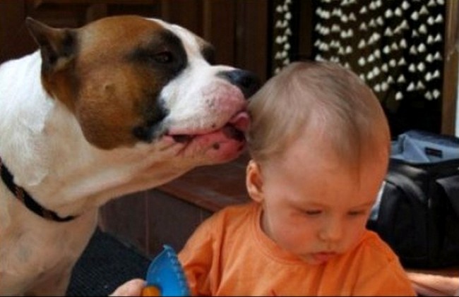 Amstaff jest bardzo przywiązany do swojej rodziny, najchętniej by się z nią ani na moment nie rozstawał. Zupełnie wyjątkowa więź łączy go z dziećmi, ma dla nich niewyczerpane zasoby cierpliwości i wyrozumiałości. Potrafi godzinami bawić się z nimi i pozwalać im na wszystko, szczególnie opiekuńcze są suki. Fakt, że amstaff jest bardzo odporny na ból powoduje, że nie reaguje nawet wtedy, kiedy małe dziecko nieświadomie robi mu krzywdę. Mimo to, tak jak w przypadku innych psów nie powinno się ich nigdy zostawiać z małymi dziećmi bez opieki dorosłych. Trzeba również zachować szczególną ostrożność w przypadku obcych dzieci, w stosunku do których jego cierpliwość może się szybciej wyczerpać.