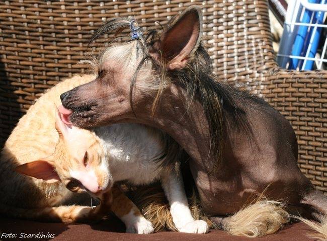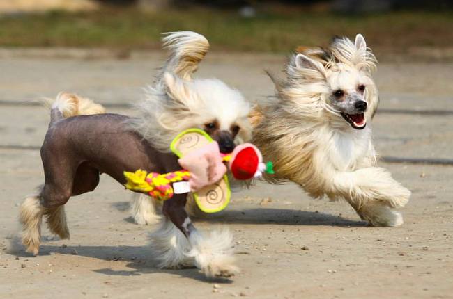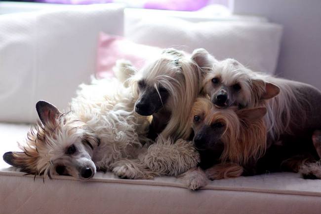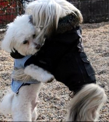 Chińskie grzywacze są bardzo przyjazne zarówno w stosunku do ludzi, których znają, jak i czworonogów, z którymi są blisko zaprzyjaźnione. Mają wyjątkowo długie, tzw. zajęcze łapy, którymi bez problemu potrafią przytrzymać sobie każdą zabawkę, ulubiony smakołyk a także czule obejmować swojego opiekuna. Kiedy są na rękach, lubią przytulić się do swojego pana i podobnie jak dziecko objąć go za szyję. Jak widać na zdjęciu, z równą serdecznością potrafią witać swoich bliskich, spotkanych na spacerze przyjaciół. Uroczy widok !