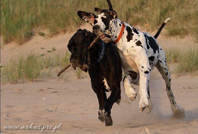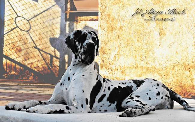 Nauka posłuszeństwa nie jest jego pasją, szkoli się trudno, jest raczej leniwy i z wielkim wdziękiem próbuje się migać. Jest psem inteligentnym i można go wielu rzeczy nauczyć, ale bywa uparty a popisywanie się posłuszeństwem i poprawnym wykonywaniem komend w rodzaju „do mnie” lub „waruj”, uważa za niepotrzebne i niepoważne. Ale jak chce, to potrafi. Kiedy chodziłam na szkolenie PT z moim psem, na placu zjawiła się bardzo przejęta swoją rolą kilkuletnia dziewczynka z dogiem. Przypuszczaliśmy, że rodzice po prostu chcieli zrobić dziecku przyjemność, tymczasem ten olbrzym był w nią wpatrzony jak w obrazek i perfekcyjnie wykonywał każde jej polecenie. To pokazuje, że kluczem do sukcesów pedagogicznych nie jest rygor i podporządkowanie psa, tylko bliska więź z przewodnikiem i umiejętne motywowanie. Wbrew pozorom ten potężny pies jest wielkim wrażliwcem. Jeśli będziemy próbowali coś na nim wymóc, zatnie się i odmówi współpracy, natomiast dla uwielbianej pani zrobi wszystko i podporządkuje się jej nie dlatego, że jest do tego zmuszany, tylko dlatego, żeby jej zrobić przyjemność i zasłużyć na pochwałę.