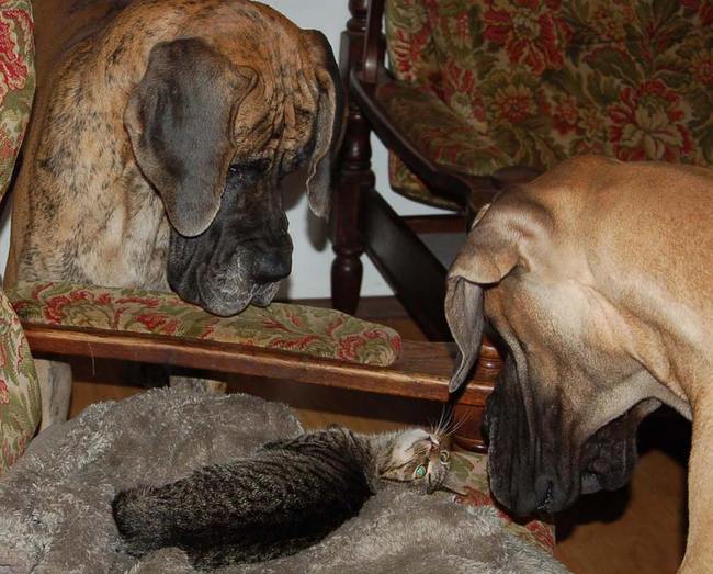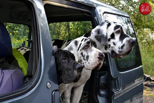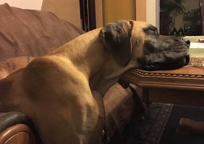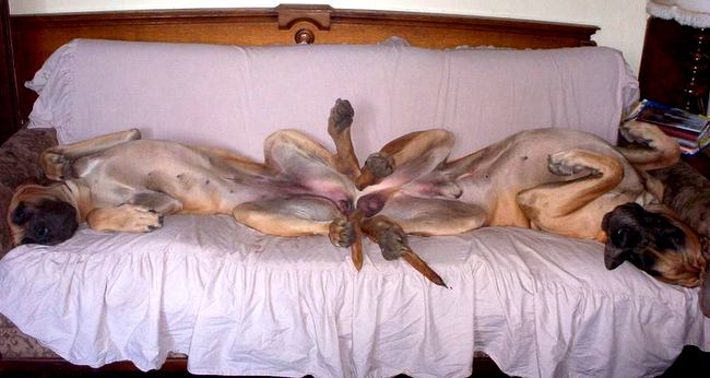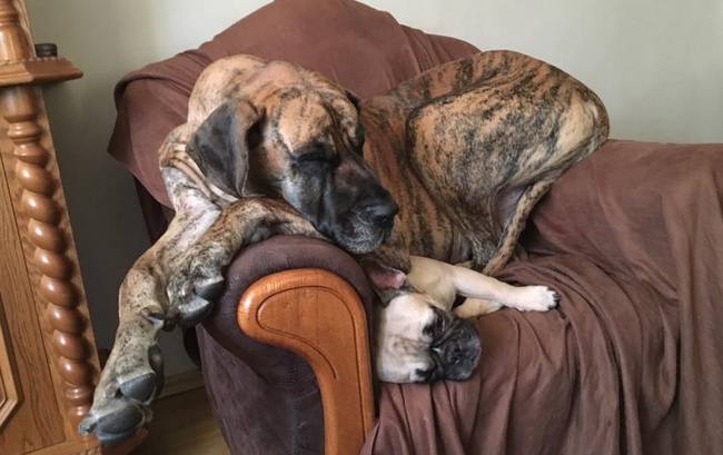 - Dogi bardzo chętnie korzystają z kanap i foteli swoich właścicieli i w odróżnieniu od innych psów siadają na nich tak jak ludzie. Pierwszy raz zobaczyłam to w poczekalni przychodni weterynaryjnej. W pewnej chwili weszła dodrobniutka pani z wielkim dogiem, a kiedy usiadła na krześle, pies bez chwili wahania odwrócił się i usiadł jej na kolanach. Widoczny na zdjęciu George waży 111 kg i chyba tylko dlatego musi siedzieć obok swojej właścicielki na kanapie a nie na jej kolanach.