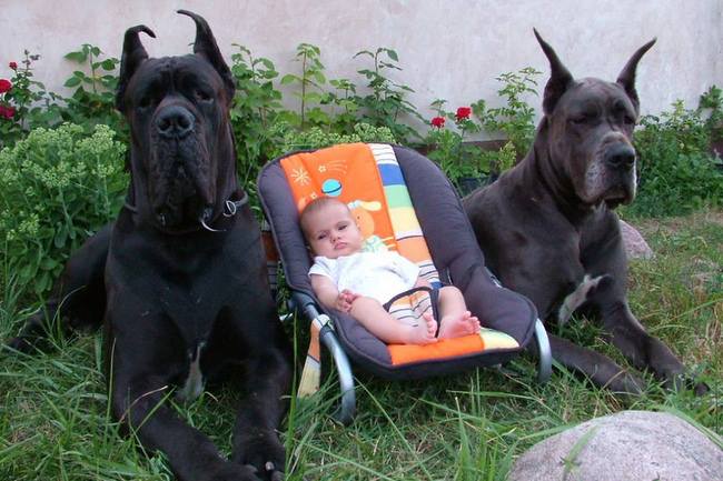 Bardzo lubi dzieci, jest wobec nich opiekuńczy i jak na swoje możliwości delikatny. Czuje się za nie odpowiedzialny i nie ma mowy, żeby on sam lub ktoś obcy w jego obecności zrobił dziecku krzywdę. Dotyczy to jednak psa dorosłego, bo zanim spoważnieje, trzeba się liczyć z tym, że w ferworze zabawy może niechcący dziecko przewrócić. Dlatego też wspólne zabawy powinny się zawsze odbywać pod nadzorem dorosłych. Rodzice muszą nie tylko starannie wychować psa, ale również nauczyć dziecko, że nie wolno nadużywać jego cierpliwości, ciągnąć go za ogon i niepokoić, kiedy zmęczony wrócił ze spaceru i śpi w swoim legowisku.