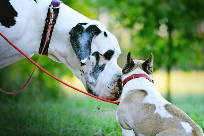 Pozytywne nastawienie do otoczenia przejawia się również w jego stosunku do innych zwierząt. W domu akceptuje wszystkie zwierzęta, zwłaszcza jeśli się razem wychowały. Na spacerze małe psy ignoruje, nigdy nie odpowiada na ich zaczepki i oszczekiwanie, wydaje się być tym ubawiony. Z dużymi również do konfliktów nie dochodzi, chyba, że ktoś z jego rodziny lub on sam zostanie przez nie zaatakowany. Ma wspaniały charakter, doceni to każdy, kto choć raz miał psa rzucającego się bez przerwy na wszystko co się rusza. Najlepiej widać to na wystawach – przy większości ringów jest zamieszanie, psy są poddenerwowane, ujadają, rzucają się na przechodzących ludzi i inne psy. Ring dogów niemieckich to oaza spokoju, nie szczekają, stoją spokojnie blisko siebie jakby od dawna się znały, a przecież większość z nich widzi się po raz pierwszy.