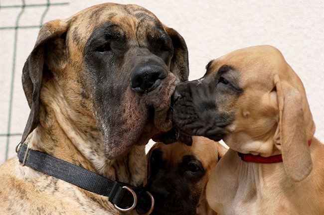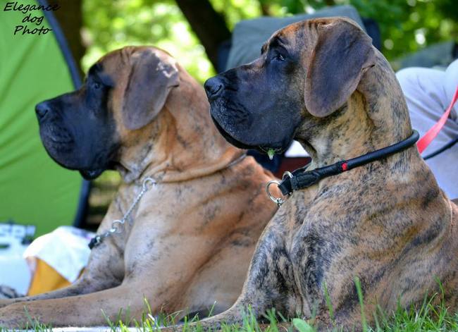 To, jaki jest pies, zależy nie tylko od genów, ale przede wszystkim od wychowania. Trzeba sobie zdawać sprawę z tego że to, co w zachowaniu małego psiaka jest tylko denerwujące, w przypadku doga może być niebezpieczne. Mały psiak skaczący ma swojego opiekuna przy powitaniu może mu co najwyżej pobrudzić lub zniszczyć ubranie, 80-kilogramowy dog może go przewrócić i bardzo dotkliwie poturbować. Dlatego każdy, kto decyduje się na psa tej rasy musi wykazać się wyobraźnią i od początku konsekwentnie pozwalać psu tylko na to, co będzie mu wolno robić kiedy dorośnie. Nie wpuszczajmy szczeniaka do łóżka, bo po paru tygodniach albo on, albo my wylądujemy na podłodze. Jeśli choć raz pozwolimy mu wejść na kanapę, potraktuje to jako prawo nabyte i już z niego nie zrezygnuje. Coś w tym jest, że w domu w którym jest dog, po pewnym czasie pojawiają się dodatkowe fotele (oczywiście dla opiekunów a nie dla psa) lub druga kanapa. Półroczny pies bez problemu zmiecie nam wszystko z kuchennego blatu, może więc lepiej od początku nauczyć go, że nie wolno mu nic ściągać ze stołu lub nawet wchodzić do kuchni. Oczywiście będzie próbował negocjować, ale kiedy zobaczy, że właściciel jest bardziej od niego stanowczy i zawsze wykonanie swojego polecenia egzekwuje, zrozumie, że nie ma dyskusji i dość szybko, bez większych protestów się podporządkuje.
