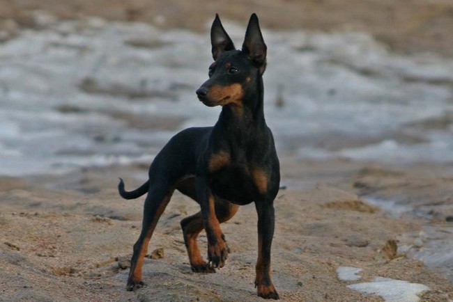 Toy terrier jest małym eleganckim pieskiem. Ma długą, wąską głowę w kształcie klina, z małymi, ciemnymi, lekko wyłupiastymi oczami oraz ukształtowanymi w formie płomienia świecy, stojącymi uszami. Długa i smukła szyja przechodzi w prosty, krótki grzbiet. Klatka piersiowa głęboka, silne lędźwie oraz nisko noszony ogon, który nawet w momentach podekscytowania nie może być zakręcony. Kończyny proste, delikatne, pies w ruchu przypomina biegnącego kłusem konika.