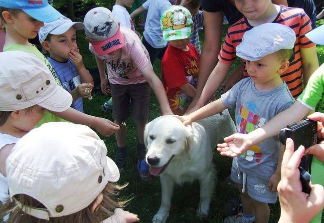 “Hodowla goldenów i kynoterapia – te dwa kierunki od jakiegoś czasu bardzo się w moim życiu splotły, dlatego chciałabym podzielić się moimi spostrzeżeniami i doświadczeniami na temat przydatności tej rasy w kynoterapii – pisze p. Ewa Szeligowska – Nie pomniejszając roli innych ras w kynoterapii, chciałabym jednak wyróżnić golden retrievera. Od zarania jego dziejów był nie tylko pomocnikiem myśliwego, ale też przywiązanym i oddanym przyjacielem. Łączył pracę aportera z rolą najwierniejszego druha. Przez lata kształtowały i utrwalały się w nim cechy, które teraz czynią go jednym z najlepszych psów kynoterapeutycznych. Jego delikatność, czułość i chęć przysłużenia się człowiekowi są wręcz legendarne. Jest to „wielki złoty przyjaciel”, który odpowiednio poprowadzony otoczy swą opieką każdego, kto jest w potrzebie. Jest łagodny, spokojny, lecz odpowiednio aktywny, by spełniać swą rolę zarówno jako pies terapeutyczny, jak i przyjaciel oraz członek rodziny.