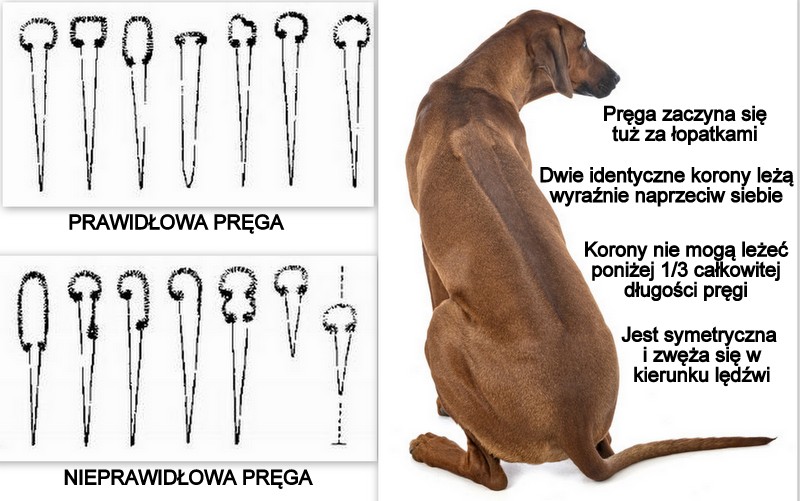 rhodesian ridgeback charakterystyka pielęgnacjaJak widać wzorzec bardzo dokładnie określa wygląd pręgi. Jej brak lub wadliwe ukształtowanie oznacza dyskwalifikację. Dlatego przed zgłoszeniem psa na wystawę warto obejrzeć jego pręgę i sprawdzić czy odpowiada wzorcowi. Górna linia pokazuje prawidłowe ukształtowanie pręgi, dolna wadliwe. W przypadku wątpliwości zawsze można zasięgnąć porady w Związku Kynologicznym.