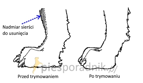 Tylne kończyny powinny być mocne i dobrze umięśnione. Poczynając od góry odpowiednim trymowaniem trzeba wymodelować udo, które oglądane z boku powinno robić wrażenie dobrze umięśnionego, ale nie ciężkiego. Patrząc na psa z boku bardzo ważne jest wyskubanie sierści na wysokości stawu skokowego tak, żeby podkreślić dobre kątowanie. Udo powinno być ładnie zarysowane, dalej, od stawu skokowego aż do łapy podudzie powinno być proste, ustawione prostopadle do podłoża. Idąc więc od pachwiny do łapy, zostawiamy więcej włosa na udzie, a potem trymujemy krótko przednią stronę podudzia, żeby pogłębić kątowanie. Jeśli chodzi o tylną linię, czasem trzeba usunąć portki, których u wilczarza być nie powinno, aż do stawu skokowego trymujemy bardzo krótko. Natomiast poniżej stawu skokowego, jeśli pies ma słabe kątowanie a sierści jest dostatecznie dużo, można spróbować je optycznie poprawić zostawiając z tylnej strony podudzia więcej włosa, ale wyrównać go tak, żeby zewnętrzna linia była prostopadła do podłoża. W miejscach oznaczonych na szkicu tułowia linią przerywaną, sierść na udach i łopatkach po wytrymowaniu można wyrównać degażówkami. Pamiętajmy, że wilczarz, jak przystało na charta jest raczej płaski i pozostawienie zbyt dużej ilości włosa na bokach może spowodować, że stanie się ciężki.