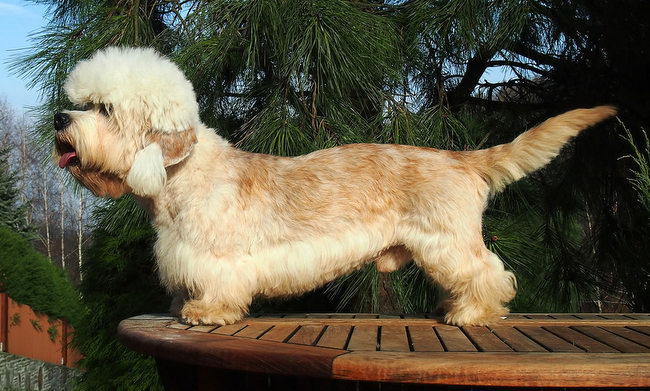 Dandie ma przednie nogi wyraźnie krótsze, co nadaje jego sylwetce oglądanej z profilu bardzo charakterystyczną linię: od kłębu obniżona, potem z lekka wznosi się i zaokrągla ku górze, tworząc łuk z najwyższym wzniesieniem w partii lędźwiowej, po czym łagodnie opada ku nasadzie ogona. Nie należy więc uwydatniać kłębu i wyrównywać linii grzbietu tak, żeby opadała równą linią w kierunku ogona, jak to jest u większości ras, bo w przypadku danie dinmont terriera byłoby to dużym błędem. Prawidłową linię grzbietu widać na poniższym zdjęciu.