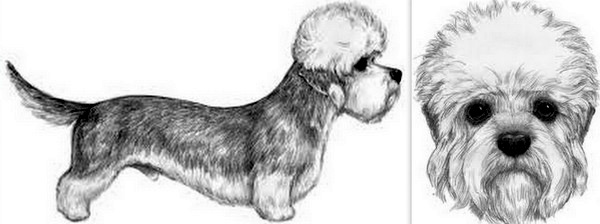 Szkice pokazują sylwetkę dandie dinmont teriera. Zadaniem osoby przygotowującej psa do wystawy jest jej odpowiednie wyeksponowanie i jeśli pojawi się taka potrzeba, zamaskowanie ewentualnych niedoskonałości.