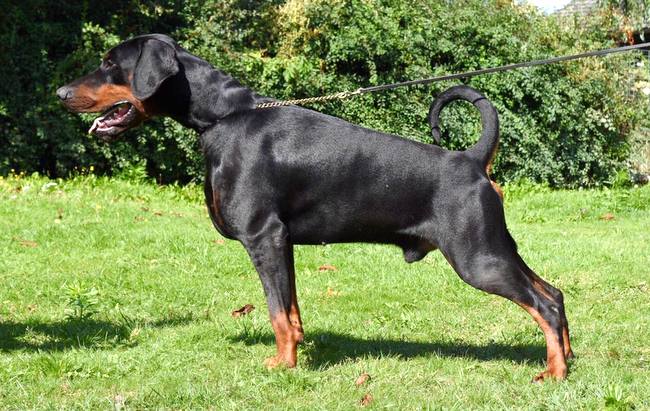 Umaszczenie czarne lub czekoladowe z intensywnie kasztanowym, czystym oraz wyraźnie odgraniczonym podpalaniem. Podpalanie występuje na kufie, w postaci pojedynczej plamki na policzkach i nad oczami, na spodzie szyi, parzyście na klatce piersiowej, na nadgarstkach, śródręczach, śródstopiach i łapach, wewnętrznej stronie ud i ramion oraz na spodzie ogona.