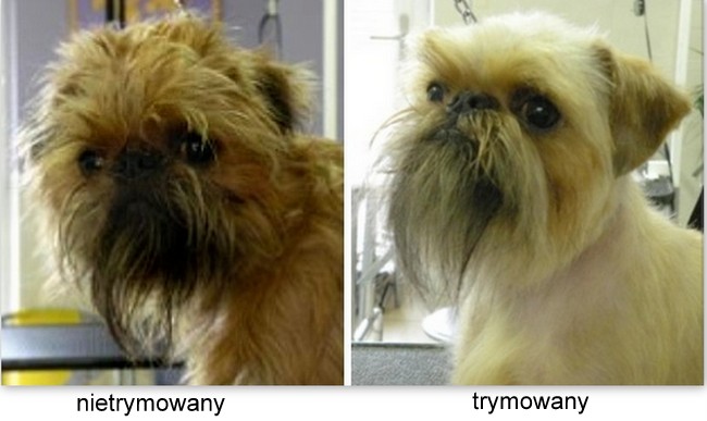 Trymuje się tylko psy szorstkowłose, czyli gryfoniki brukselskie i belgijskie. Do pierwszego trymowania przystępujemy kiedy piesek ma około 3-4 miesięcy, w momencie gdy zauważymy, że uchwycony palcami włos da się bez trudu wyskubać. Zaczynamy od grzbietu, kilka tygodni później trymujemy szyję, łopatki i uda. Te części ciała są bardziej wrażliwe, dlatego trzeba je trymować z wyczuciem i delikatnie. Pierwsze trymowanie jest zawsze najtrudniejsze, najbardziej pracochłonne, ale i najważniejsze, bo to ono decyduje o późniejszej jakości szaty. Dzięki niemu pies będzie miał prawidłową, szorstką sierść. Każde następne trymowanie będzie łatwiejsze. Jeśli jednak przestaniemy trymować, sierść stanie się znowu miękka i cały nasz trud pójdzie na marne, bo trzeba ją będzie na nowo wypracować.