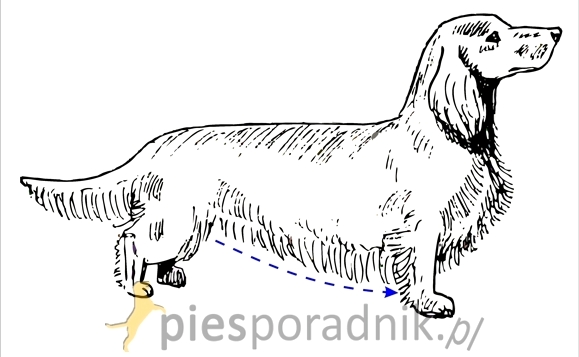 Ogon powinien być bogato owłosiony. Wyciągamy go poziomo i wyczesujemy w dół a następnie wyrównujemy nożyczkami. Linia cięcia powinna biec ładnym łukiem tak, by włos u nasady ogona był najdłuższy i w kierunku jego końca schodził do zera. Pamiętajmy, że tnie się zawsze od czubka w kierunku nasady ogona. Ogon trzyma się bardzo delikatnie na wysokości przedostatniego kręgu a nie za włos, bo pies będzie usiłował go wyrwać.