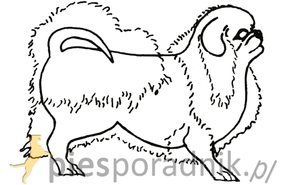 Poniższy szkic pokazuje sylwetkę, jaką powinien mieć wybierający się na wystawę pekińczyk. Widać gładką sierść na głowie, uwydatnione przedpiersie połączone z ładnie zarysowaną dolna linią i wspaniały ogon.