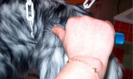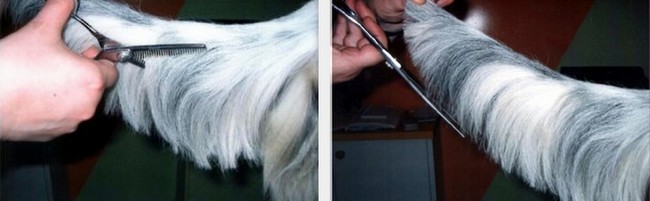 Następnie wyciągamy go poziomo i ostrymi prostymi nożyczkami wyrównujemy włos półkolistym łukiem począwszy od końca ogona w kierunku jego nasady. Powinno się trzymać ogon w miejscu ostatnich kręgów a nie za włos, bo to sprawia psu ból i będzie się wyrywał. Przez przycinaniem sierści warto zaznaczyć optymalną długość ogona, który powinien sięgać do stawu skokowego i od tego miejsca rozpocząć cięcie. Lepiej zostawić więcej niż za mało. Włos u nasady ogona w okolicy odbytu trzeba delikatnie usunąć nożyczkami.