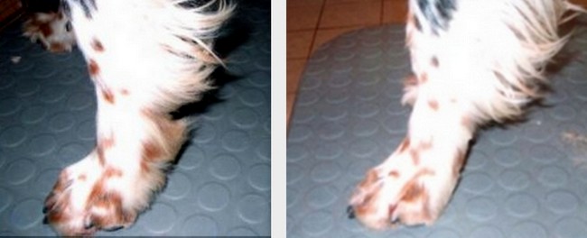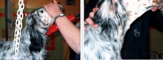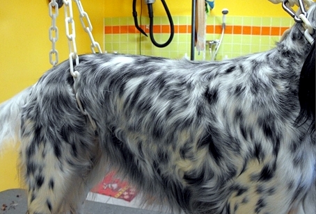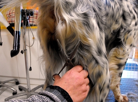 Łapy setera powinny być małe i zwarte, w rzeczywistości są często bardzo mocno owłosione, co nie dodaje im urody. Włos rosnący między palcami wyczesujemy i skracamy. Stawiamy psa na równym podłożu, podczesujemy sierść w górę i przycinamy ją nożyczkami degażującymi. Następnie sczesujemy sierść do dołu i skracamy ją na okrągło tak, żeby nie kładła się na ziemi.