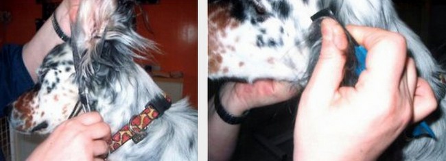 Brzeg małżowiny usznej, szczególnie z przedniej strony jest często porośnięty odstającymi i zawijającymi się kosmykami, które również trzeba skrócić, najlepiej trymerem, żeby ucho nie wydawało się zbyt szerokie, zwłaszcza u nasady. Pozostaje dokładne wyczesanie i wyrównanie włosa na dole małżowiny usznej. Dolny brzeg powinien być lekko zaokrąglony a długość taka, by wyciągnięte do przodu ucho sięgało czubka nosa. Gordonom zostawia się dłuższy włos, nic nie stoi na przeszkodzie, żeby podobnie wyglądały uszy anglików czy też irlandów, wszystko zależy od tego w jakiej wersji głowa psa lepiej się prezentuje. Najczęściej ucho pokryte długim włosem, tylko lekko na końcach zaokrąglonym i wyrównanym wygląda bardziej naturalnie i elegancko.