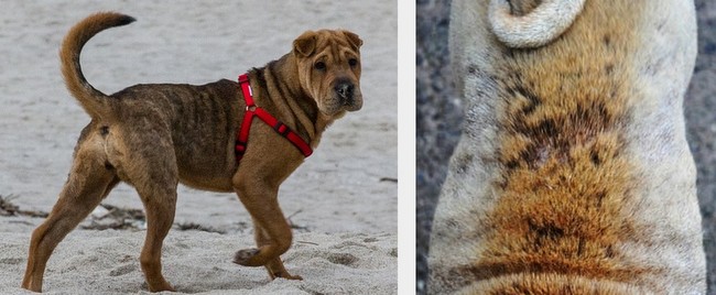 Sezonowe linienie jest zjawiskiem normalnym, pies traci część owłosienia a na jego miejsce wyrasta nowe. Żaden właściciel nie wpada z tego powodu w panikę, stara się uzbroić w cierpliwość i jakoś przeczekać ten okres. Shar pei jest psem nietuzinkowym, trudno się więc dziwić, że sposób w jaki linieje jest tak nietypowy, że jego właściciel zaczyna podejrzewać, ze pies ma jakieś poważne schorzenie skóry. Podczas gdy inne psy gubią pojedyncze włosy, u shar pei’a sierść wypada zbitymi kępkami, pozostawiając odmienne w kolorze plamy. Najbardziej spektakularne jest pierwsze linienie, czyli wymiana szczenięcego włosa na dorosły. Ma to miejsce między 8 a 15 miesiącem życia, pies pozbywa się puszystego szczenięcego włosa a na jego miejsce pojawia się typowa dla rasy twarda, drutowata i nastroszona sierść. Bywa, że w okresie linienia występuje podrażnienie skóry, ale jeśli pies będzie otrzymywał dobrze zbilansowaną, bogatą w witaminy i nienasycone kwasy tłuszczowe Omega 6 i Omega 3 dietę, wraz z końcem linienia wszystko wróci do normy. Na skórę można stosować dobrej jakości odżywkę regenerującą, usuwać luźne kępki sierści i jak najczęściej ją szczotkować. Każde następne linienie będzie przebiegało łagodniej, ale za każdym razem pies wymienia całe owłosienie. Plamami nie należy się przejmować, znikną wraz z pojawieniem się nowej sierści.