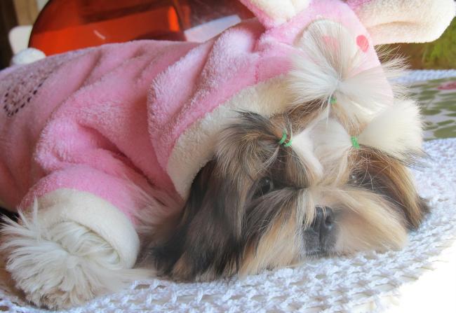 Pamiętajmy cały czas o tym, że nigdy nie wolno szczotkować i czesać na sucho, każdą rozczesywaną warstwę trzeba najpierw spryskać specjalną odżywką do rozczesywania, która wzmacnia włos, ułatwia rozczesywanie i zapobiega plątaniu i filcowaniu się sierści. Na piękną wzorcową szatę trzeba cierpliwie poczekać i ciężko zapracować. Poprawna, gruba sierść jest łatwiejsza w pielęgnacji, im bardziej jest miękka, tym łatwiej się plącze i filcuje. Jeśli więc mamy ambicje wystawowe starajmy się kupić szczenię z dobrą, wzorcową szatą. Warto wiedzieć, że prawidłowo wypielegnowana sierść shih tzu nie powinna być sztywna, tylko lejąca, jedwabista.