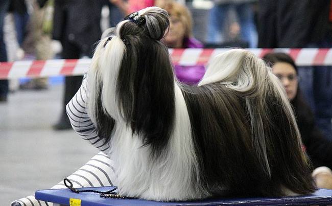Pół godziny wcześniej idziemy z psem na mały spacer, żeby się rozruszał i załatwił potrzeby fizjologiczne. Sierść będzie się wspaniale prezentowała, jeśli przed wejściem na ring dokładnie ją wyszczotkujemy i spryskamy odżywką nabłyszczającą, która działa antystatycznie i zapobiega elektryzowaniu się włosa. Wyczesujemy równy przedziałek wzdłuż grzbietu, sprawdzamy czy kucyk dobrze się trzyma i ewentualnie bardzo delikatnie utrwalamy niewidocznym lakierem. To musi być specjalny wystawowy lakier, bo szata shih tzu musi płynąć w biegu, nie może wyglądać jak skorupa.