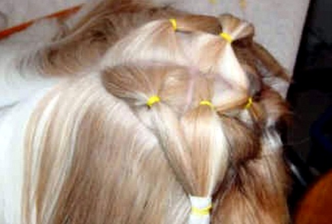 W miarę jak włos staje się coraz to dłuższy wydzielamy grzebieniem ze szpikulcem dość duży kwadrat na czubku głowy i dzielimy go na 4 równe mniejsze kwadraty. Na każdym z nich wyczesujemy kucyk i spinamy go gumką. Następnie spinamy dwa kucyki razem po prawej i dwa po lewej stronie głowy tak, by kierowały się na boki. W miarę wzrostu włosa dokładamy następne gumki, żeby chronić włos na całej jego długości. Jeśli są dobrze zrobione, pies tak się do nich przyzwyczaja, że praktycznie zapomina o ich istnieniu.