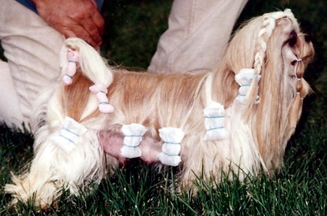 To, że pies wystawowy musi być od pierwszych miesięcy życia bardzo starannie pielęgnowany, nie trzeba przypominać. Doskonałą metodą ułatwiającą utrzymanie sierści w porządku jest upinanie jej w kitki, splatanie w warkoczyki lub wreszcie zawijanie w papiloty. Wszystko zależy od trybu życia psa, jego temperamentu i wreszcie od tego, czy w domu są inne, zabawowo nastawione zwierzęta.