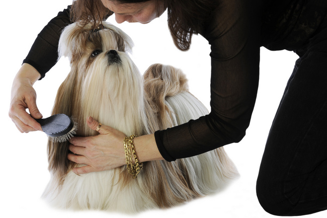 Przyzwyczajanie psa do szczotki rozpoczynamy począwszy od 7-go tygodnia życia. Jest to bardzo ważne, bo w tym wieku bez problemu podda się wszyskim zabiegom pielęgnacyjnym. Ostatnim momentem jest czwarty miesiąc, potem szczenię zaczyna mieć własne zdanie, przekonanie go do szczotki jest już trudniejsze i wymaga dużo więcej czasu. Dla shih tzu szczotkowanie jest podstawowym zabiegiem pielęgnacyjnym i to czy pies mu się chętnie poddaje, czy się wyrywa jest nie bez znaczenia. Jakość szaty zależy od tego ile czasu jej poświęcimy, jeśli ma być w idealnym stanie, trzeba przewidzieć co najmniej godzinę tygodniowo. Najlepiej szczotkować dwa razy w tygodniu, w ostateczności jeden raz, u większości psów krytycznym okresem jest, w zależności od trybu życia psa, 10-14 dni. W tym czasie włos zdąży się tak sfilcować, że trzeba będzie czasochłonnego rozplątywania supłów związanego z męczeniem psa, utratą jego zaufania i często miernym na dodatek efektem.