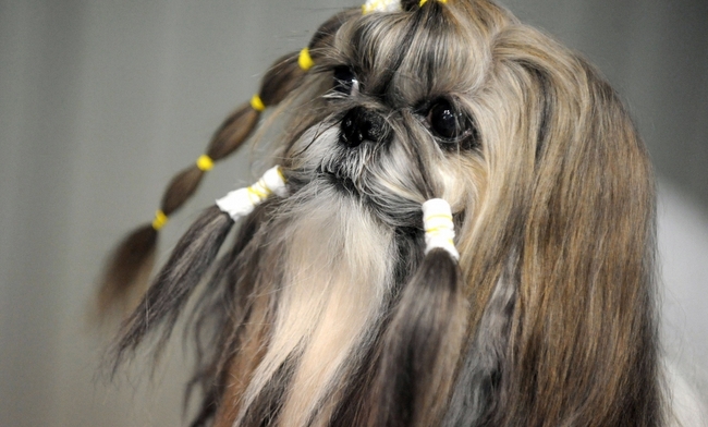 W momencie, kiedy włos jest dostatecznie długi trzeba rozpocząć spinanie włosów na głowie, co zabezpieczy je przed wyrywaniem. Na początku najlepiej upinać dwa kucyki, które trzeba każdego dnia rozczesywać. Nie mogą naciągać włosów, muszą być spięte na tyle luźno, by nie naciągać skóry na głowie i pies nie odczuwał dyskomfortu. Gumkę za każdym razem trzeba rozciąć, bo przy jej ściąganiu bardzo się niszczy i wyrywa włosy. Z czasem robimy dwa następne kucyki na brodzie. W ten sposób pies nie brudzi jej sobie przy jedzeniu. Oczywiście wystawowy shih tzu musi być karmiony dobrą suchą karmą, gotowane w domu kleiste zupki nie wchodzą w rachubę.