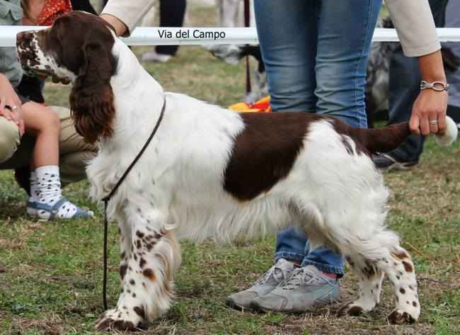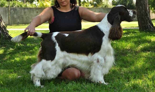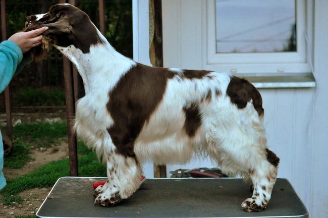 Springer spaniel ma być psem eleganckim, o zwartej budowie, silnym, ale nie ciężkim. To na co trzeba zwrócić szczególną uwag, to harmonijne, praktycznie niewidoczne przejścia między poszczególnymi partiami owłosienia. Górna część tułowia musi być depilowana, ale nie może odcinać się od dołu, tak jak siodło u charta afgańskiego. Piękne frędzle na dole tułowia powinny sprawiać wrażenie jakby brały początek na grzbiecie i potem spływały wzdłuż ciała, nie powinny odstawać, ani być poskręcane. Szczotkujemy je bardzo starannie i jeśli trzeba, delikatnie przerzedzamy ustawionymi w górę a nie poziomo nożyczkami degażującymi. Dół frędzli lekko wyrównujemy tak, żeby pies zachował naturalny wygląd. Jeśli dół frędzli jest podniszczony lepiej je skrócić do miejsca w którym wygląda ładnie i zdrowo, niż pokazywać, że sierść została zaniedbana. I jeszcze jedno: jeśli pies jest za wysoki, starajmy się zostawić jak najdłuższe frędzle na dole tułowia, jeśli za niski, frędzle skracamy. Wygląd psa zdecydowanie na tym zyska.
