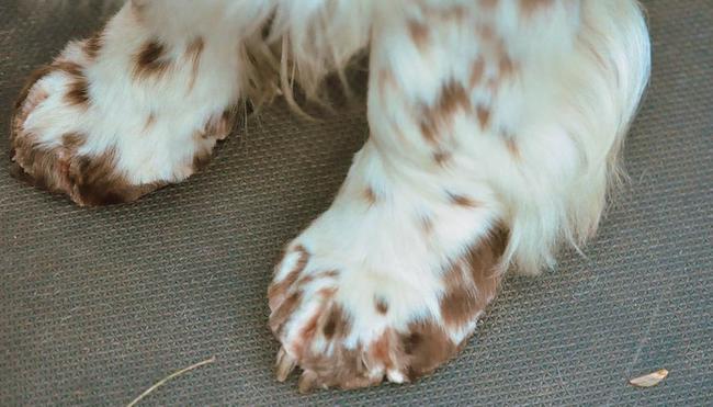 Pazury, jeśli nie zostały starte w sposób naturalny, powinny być obcięte tak, żeby nie dotykały podłogi. Najlepiej zrobić to kilka dni przed wystawą, bo gdyby się zdarzyło przyciąć któryś z nich zbyt krótko, zdąży się wygoić. Włos między opuszkami palców musi być wycięty, czasem w tym miejscu tworzy się zbity filc, który uwiera przy chodzeniu i powoduje odleżynę. Trzeba go ostrożnie wyciąć małymi nożyczkami o zaokrąglonych końcach a skórę posmarować maścią leczniczą, żeby się wygoiła. Jest to bardzo ważne, bo pies może kuleć i nie będzie w stanie odpowiednio zaprezentować się w ruchu. Jeśli wystawa odbywa się w hali, na gładkiej betonowej posadzce, pies może się ślizgać i mieć trudności z utrzymaniem równowagi. Istnieje specjalny balsam, który tworzy na opuszce warstewkę przeciwpoślizgową, zwiększa przyczepność i pozwala zlikwidować ten problem.