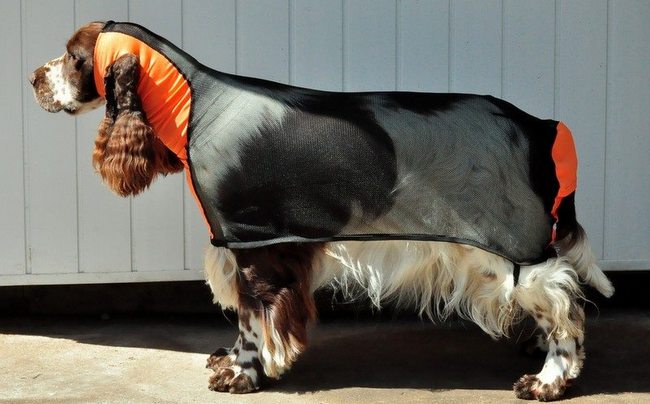 Aby po ostatniej kąpieli przed wystawą sierść na tułowiu układała się gładko i była bardziej lśniąca, możemy się wspomóc specjalnymi ubraniami wystawowymi – materiałowymi lub z siatki. Ubranie z siatki idealnie przylega do tułowia i doskonale nadaje się dla psów o bardzo niesfornej sierści. Można je stosować na włos wysuszony lub wilgotny. Pies powinien w nim pozostać przez około 3-4 godziny. Ubranie z materiału jest przeznaczone do wszystkich typów włosa. Stosujemy je tylko na wysuszony włos. Pies czuje się w nim swobodnie a najlepszy efekt uzyskujemy zakładając je na całą noc przed wystawą.