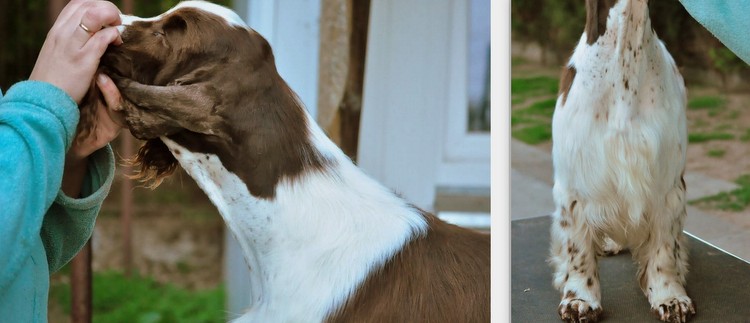 Każdy element w przygotowaniu springera do wystawy ma istotne znaczenie, ale zajmując się po kolei owłosieniem głowy, szyi, tułowia i kończyn, ani na chwilę nie można tracić z oczu całej sylwetki psa, która nie może wyglądać jakby składała się z wielu elementów tylko musi stanowić jedną, pięknie wymodelowaną bryłę, bez śladu przejść lub uskoków.