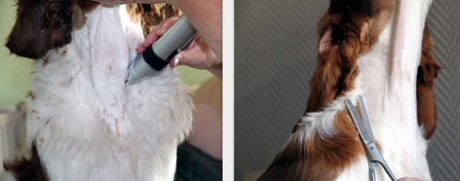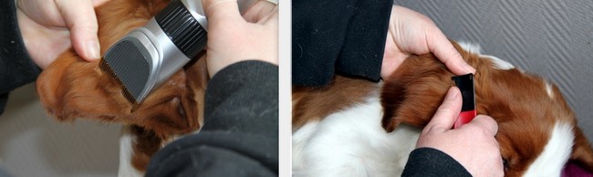Włos na wewnętrznej stronie małżowiny usznej, na około 1/3 długości począwszy od nasady ucha skracamy nożyczkami degażującymi lub maszynką. Usuwamy także sierść zarastającą wejście do kanału słuchowego, dzięki czemu ucho ładniej przylega do głowy i jest lepiej wentylowane. Przy wycinaniu włosa po wewnętrznej stronie ucha trzeba pamiętać o zabezpieczeniu kanału słuchowego tamponem waty przed dostaniem się ścinanego włosa do jego wnętrza.