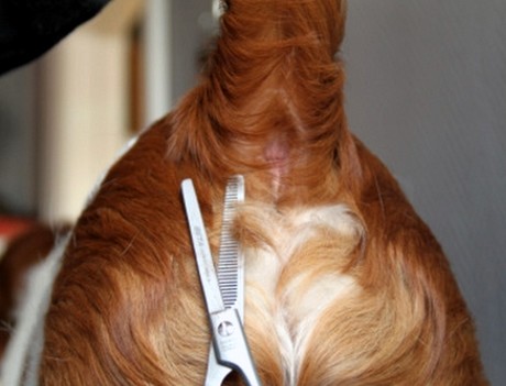 Pod ogonem skraca się sierść u jego nasady a pod nim bardzo krótko degażuje tzw. „lusterko”, żeby optycznie skrócić sylwetkę psa. Frędzle poniżej zadu należy pozostawić, będą potrzebne przy modelowaniu tylnych kończyn.