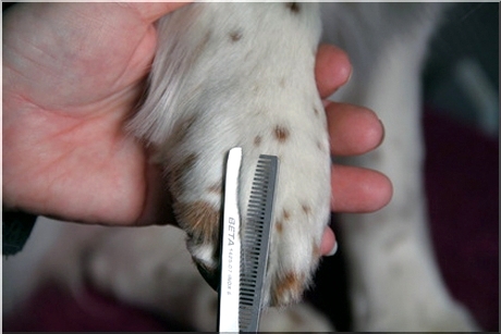 Pazury, jeśli nie zostały starte w sposób naturalny, powinny być obcięte tak, żeby nie dotykały podłogi. Najlepiej zrobić to kilka dni przed wystawą, bo gdyby się zdarzyło przyciąć któryś z nich zbyt krótko, zdąży się wygoić. Włos między opuszkami palców musi być wycięty, czasem w tym miejscu tworzy się zbity filc, który uwiera przy chodzeniu i powoduje odleżynę. Trzeba go ostrożnie wyciąć małymi nożyczkami o zaokrąglonych końcach a skórę posmarować maścią leczniczą, żeby się wygoiła. Jest to bardzo ważne, bo pies może kuleć i nie będzie w stanie odpowiednio zaprezentować się w ruchu. Jeśli wystawa odbywa się w hali, na gładkiej betonowej posadzce, pies może się ślizgać i mieć trudności z utrzymaniem równowagi. Istnieje specjalny balsam, który tworzy na opuszce warstewkę przeciwpoślizgową, zwiększa przyczepność i pozwala zlikwidować ten problem.